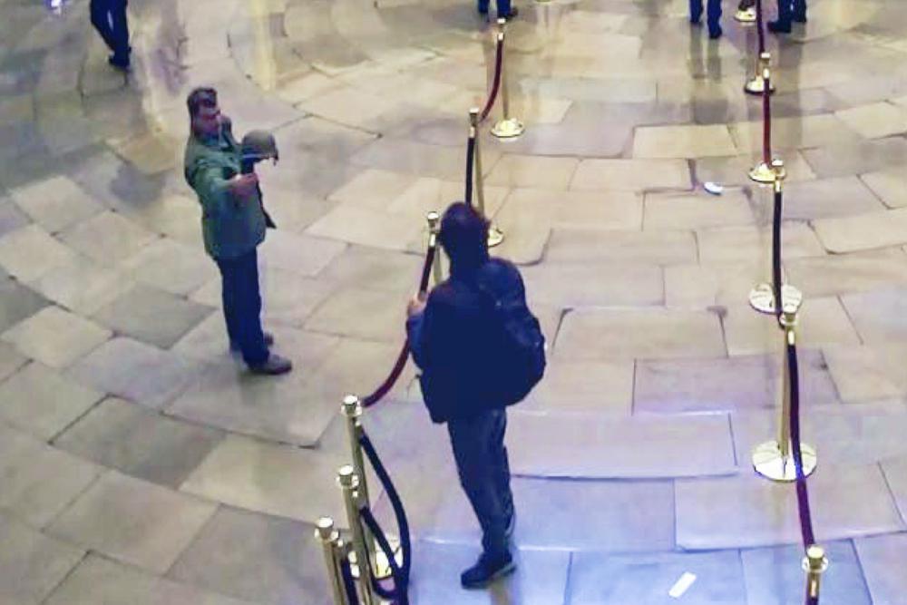 FILE - This image from an FBI affidavit filed in federal court in Washington, D.C. and taken from U.S. Capitol Police closed-circuit TV surveillance footage, shows Eric Barber, left, taking a selfie inside the Capitol Rotunda on Jan. 6, 2021, in Washington. Barber was sentenced Tuesday, June 14, 2022, to 45 days in prison for his role in the breach of the Capitol. (U.S. Capitol Police via AP, File)