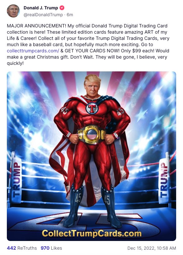 (15,668 posts)1. Since he desperately announced for the presidency waaaaaay early, the RNC had to stop helping him fund his defenses in the multiple lawsuits/investigations against him, I bet his normal grifting isn't covering his lifestyle and legal needs. He probably doesn't have a lot of cash on hand as it looks like from his finally-released taxes that he's in debt to a lot of people including North Korea. His only real successful business has been the grift - especially selling red hats to morons then hitting them up repeatedly - and this was the best idea he could come up with... Months after the NFT market imploded. There really needs to be a card of him holding a Beanie Baby in one hand and a Dutch Tulip in the other to truly capture his business acumen.