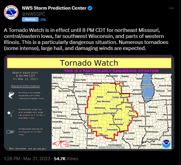 Two PDS (Particularly Dangerous Situation) Tornado Watches issued. Heads up IA/WI/IL/MO/AR