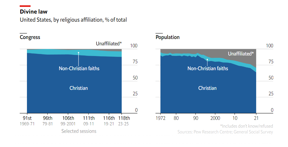 In 1952 president-elect Dwight Eisenhower set out what he saw as a cornerstone of American democracy: Our form of government has no sense unless it is founded in a deeply felt religious faithand I dont care what it is. His words still loom over American politics. Almost 88% of members of the 118th Congress, which convened on January 3rdbut whose House members have not yet elected a speakerare Christian. That share has barely shifted since the late 1970s (see chart). Only two membersless than half of 1%say they are not religious.
