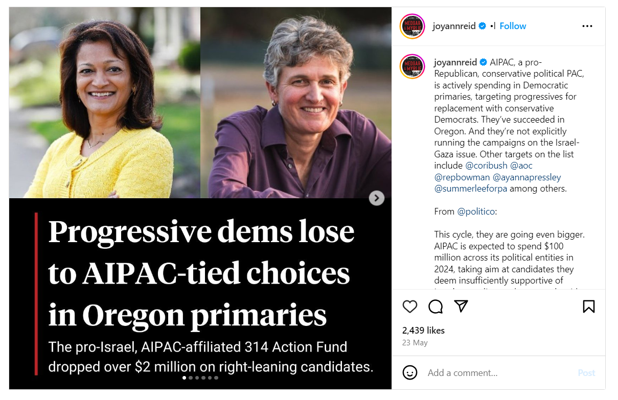 (52,714 posts)AIPAC, a pro-Republican, conservative political PAC, is actively spending in Democratic primaries, targeting progressives for replacement with conservative Democrats. Theyve succeeded in Oregon. And theyre not explicitly running the campaigns on the Israel-Gaza issue. Other targets on the list include @coribush @aoc @repbowman @ayannapressley @summerleeforpa among others.