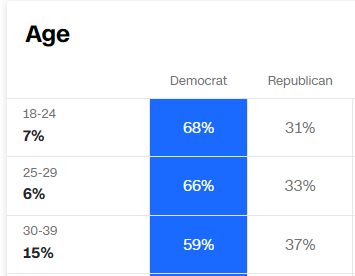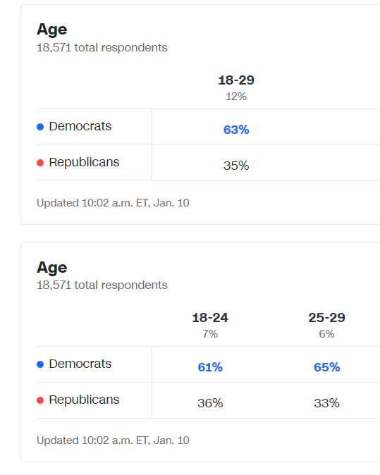 You can start to see it in the 2022 exits polls, with the 25-29 (at that time) cohort (that only contains a tiny 11 month sliver of Gen Z) voting more (+7 on net) Dem than the 18 to 24 (at that time) 'all Gen Z' cohort.