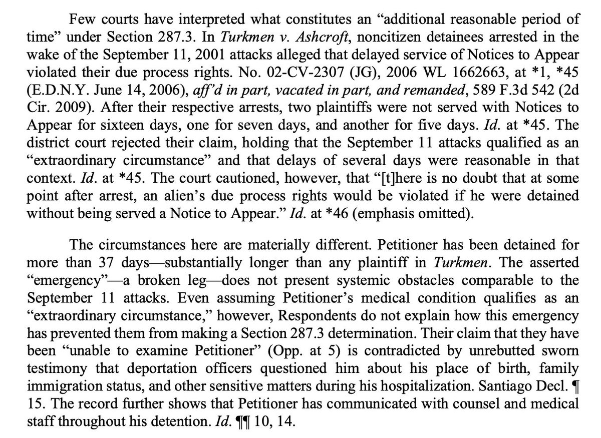 The judge notes that noncitizens detained after 9/11 weren't held nearly as long without notice for the legal basis.