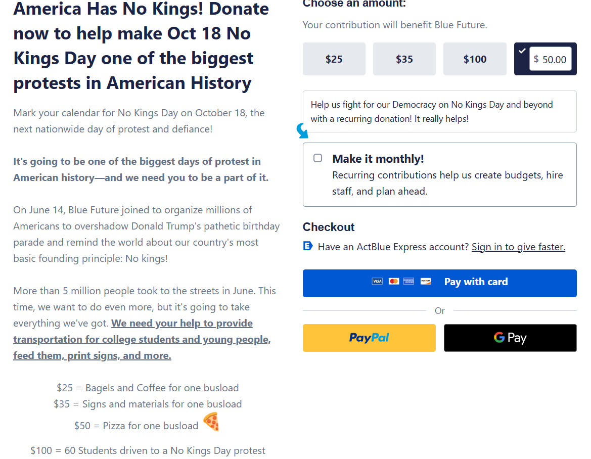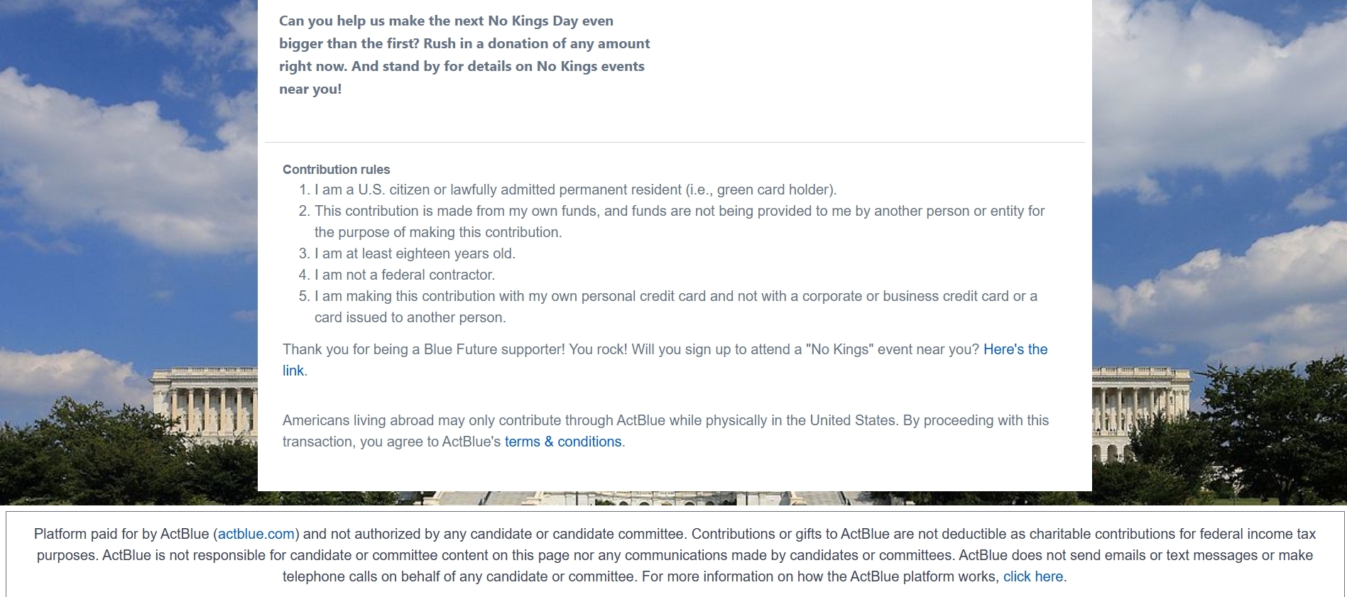 (52,468 posts)or gifts to ActBlue are not deductible as charitable contributions for federal income tax purposes. ActBlue is not responsible for candidate or committee content on this page nor any communications made by candidates or committees. ActBlue does not send emails or text messages or make telephone calls on behalf of any candidate or committee. For more information on how the ActBlue platform works, click here.