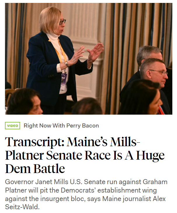 In the latest episode of Right Now With Perry Bacon, Seitz-Wald discussed how Platner has come out of nowhere to be a phenomenon in the state. Seitz-Wald said the enthusiasm for Platner is real but questioned if Platner has real working-class supporters or if his base is largely college-educated progressives. He noted that Mills is fairly popular but will be bogged by questions about her age (77). Collins, according to Seitz-Wald, still has a very good chance of winning. While the state leans Democratic, Collins has done a great job distancing herself from Trump and building strong ties with local powerbrokers in Maine, he said.