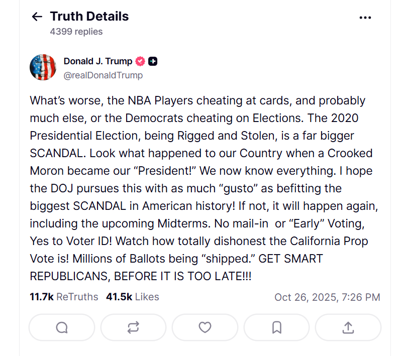 Trump had previously vowed to eradicate mail-in ballots back in August, and again without having the authority to do so. In his social media post Sunday, however, he also vowed to eradicate early voting, and singled out California for its upcoming ballot measure to redraw its congressional districts, a measure passed in response to Texas redistricting that was designed to bolster the GOPs numbers in Congress.