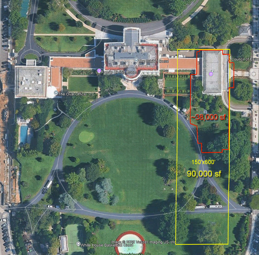 Last week, I posted a graphic from Wikipedia showing the footprint of the King #rump Royal Ballroom, as estimated from the model shown by the White House earlier this month. I estimated that the footprint was only about 38,000 square feet.