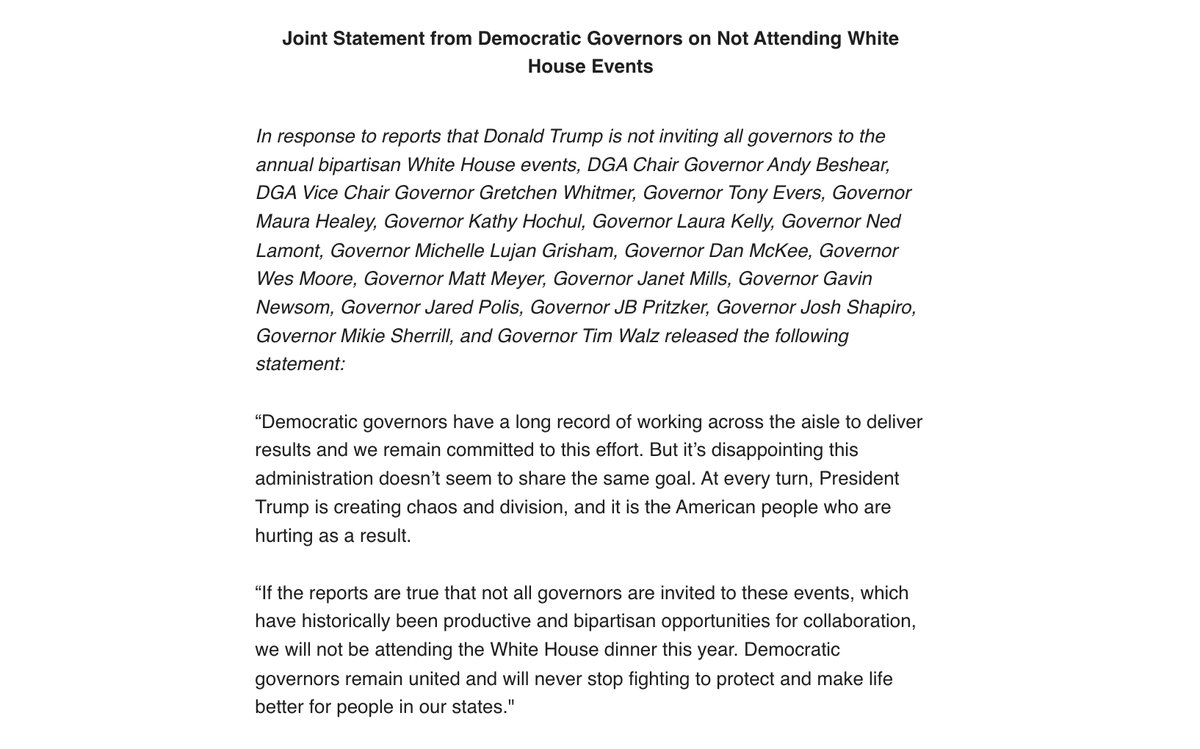 (9,376 posts)The NGA is having an annual event in DC on February 19-21. That event is still happening. Traditionally, part of that event is a meeting between the all the Governors and the President. That traditional meeting has been removed from the agenda for the NGA meeting. The rest of the NGA meeting will still take place.