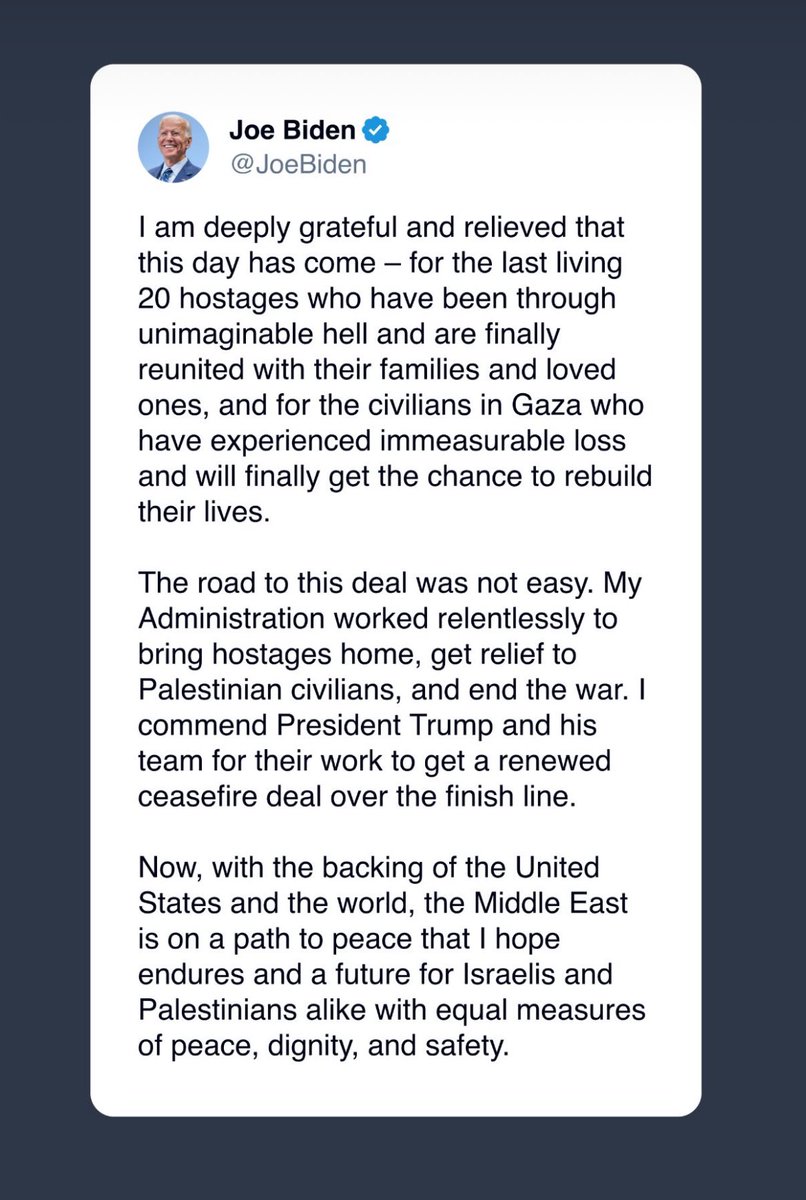 (20,974 posts)"I commend President Trump and his team for their work to get a renewed ceasefire deal over the finish line," Biden wrote.