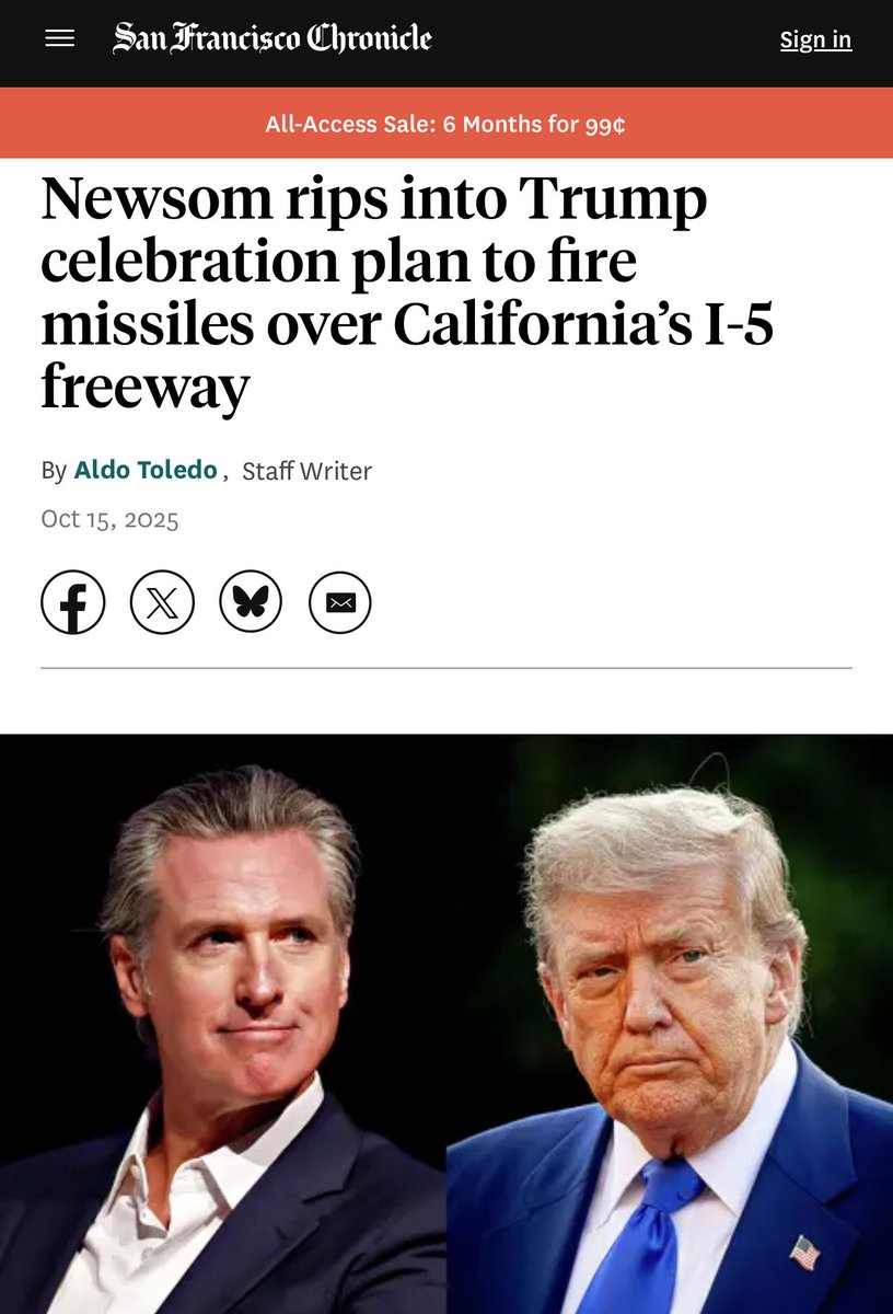 But it also reports this: "Media outlet MediaTouch, citing unnamed sources, reported that the Trump administration may launch missiles from Warships into California. Regarding the I-5 closure, the report states: "Sources close to MeidasTouch describe the closure as part of a 'vanity parade' that may involve Navy warships shooting live missiles into Camp Pendleton as a 'show of force.'