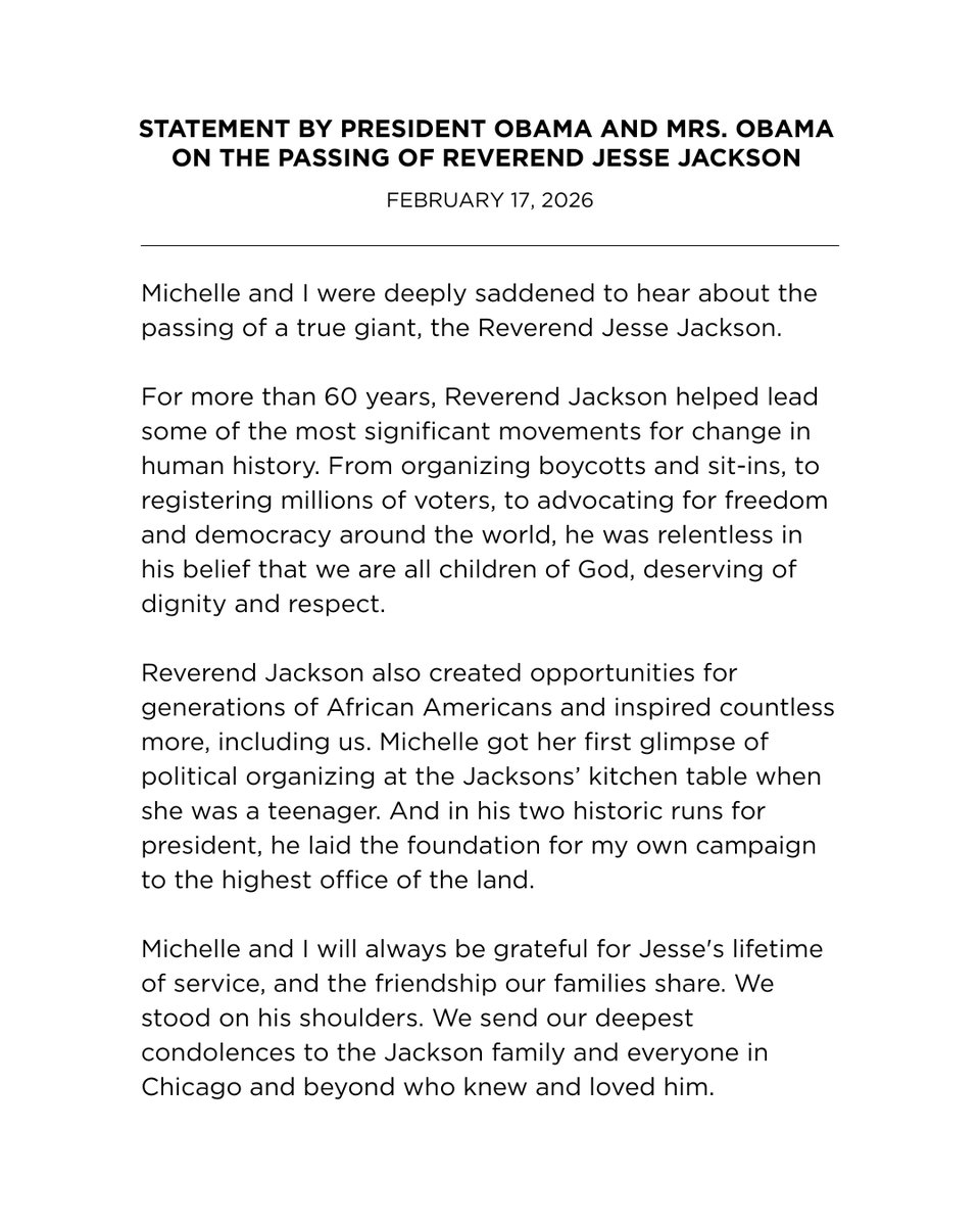 "Our father was a servant leader not only to our family, but to the oppressed, the voiceless, and the overlooked around the world, the Jackson family said in a statement. We shared him with the world, and in return, the world became part of our extended family. His unwavering belief in justice, equality, and love uplifted millions, and we ask you to honor his memory by continuing the fight for the values he lived by.