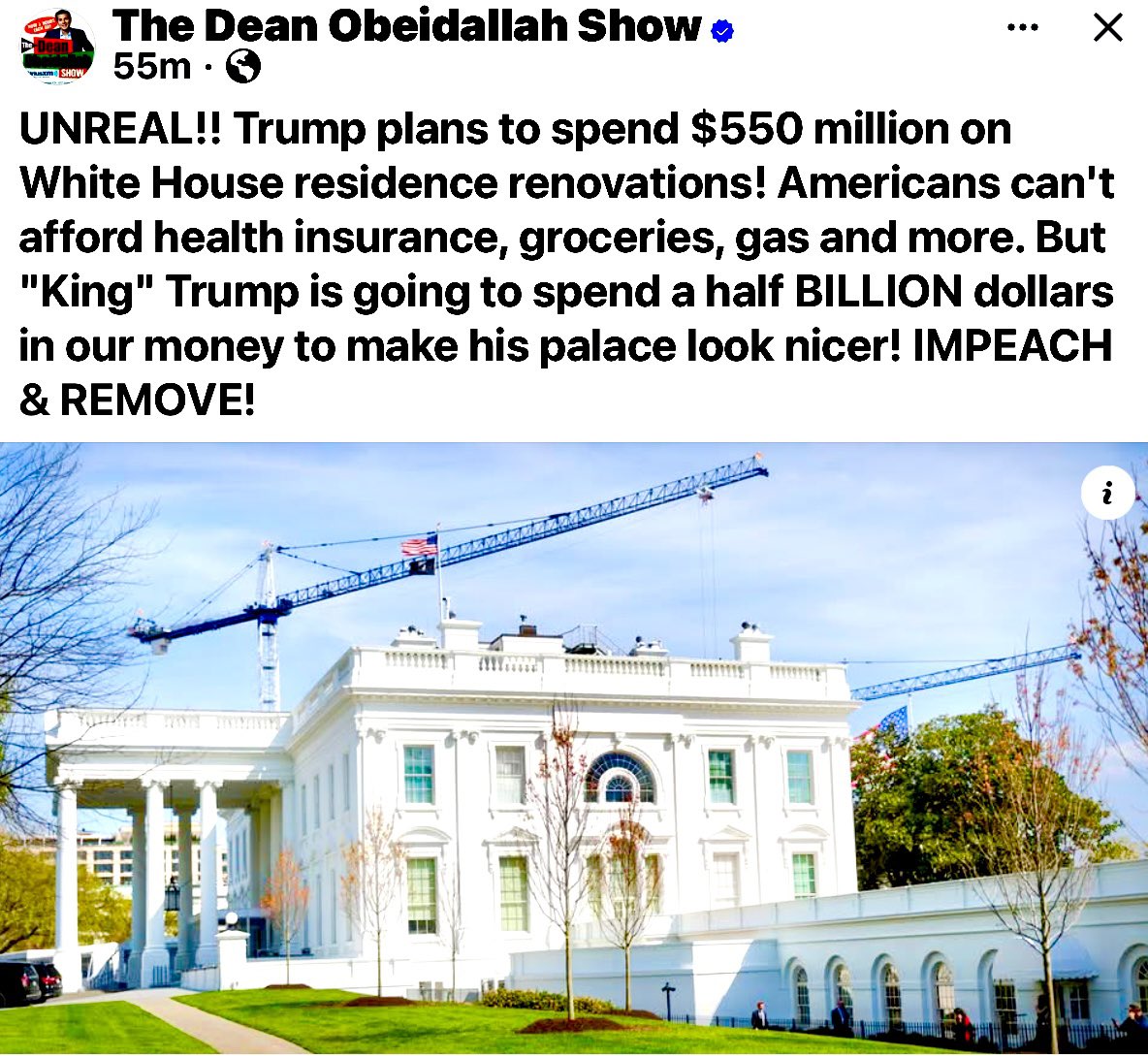(29,763 posts)Why can't this guy get it through his thick skull that the White House doesn't belong to him to do what he wants with it? Millions and millions of our dollars on tacky gold shit, while he's talking about cutting Medicare/Medicaid, and blowing a minimum of one BILLION bucks a day on his Iran war.