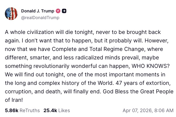 Welp, guess Trump has penciled in today as biggest bombing day ever, with 93 million people cut off from power and water and/or blasted to smithereens, or Trump will chicken out. But he sure sounds QUITE hot to trot, posting this morning: