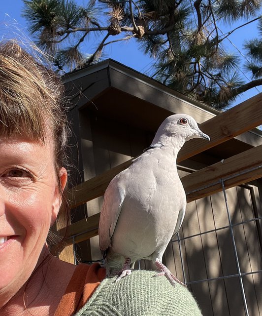 he will randomly land on my head without warning. Ive gotten used to that. He runs with a flock of 6 or so other doves that will not tolerate me in the yard at all