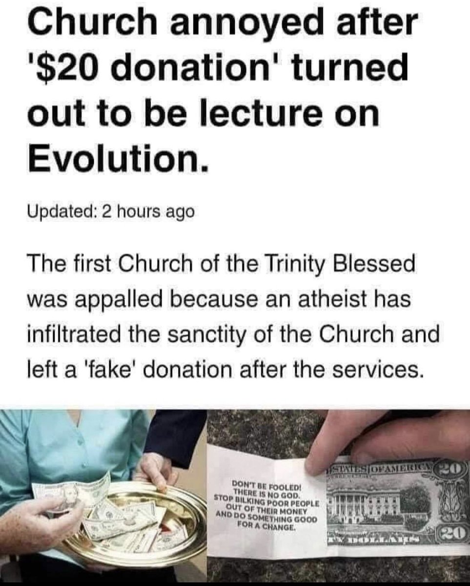 (*Satire... original source: https://www.religimarole.com/post/church-annoyed-after-20-donation-turned-out-to-be-lecture-on-evolution)