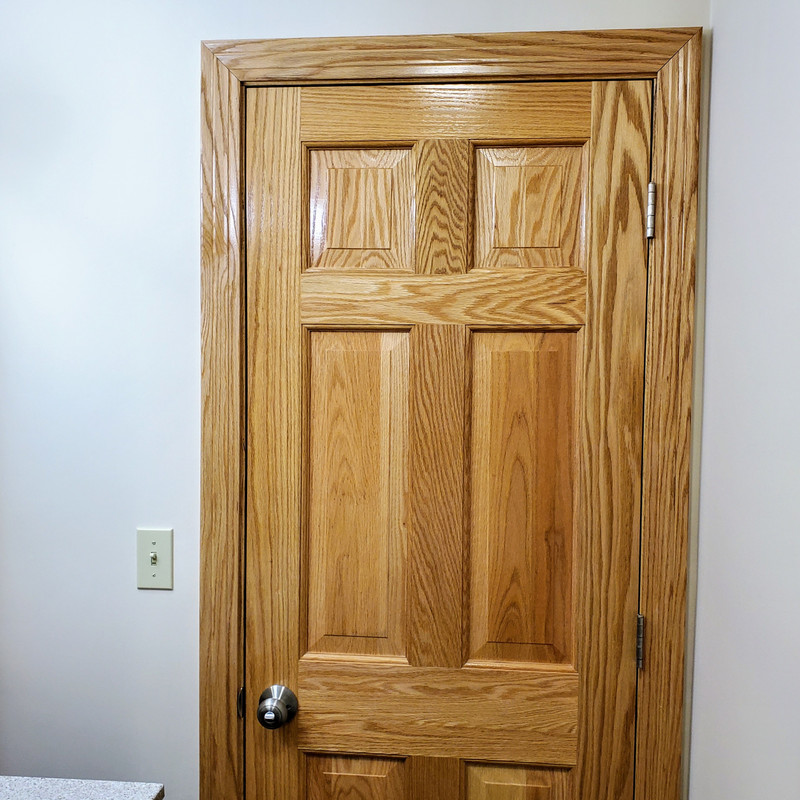 Door and door trim are red oak, pre-finished at the lumber mill with semi-gloss clear coat.