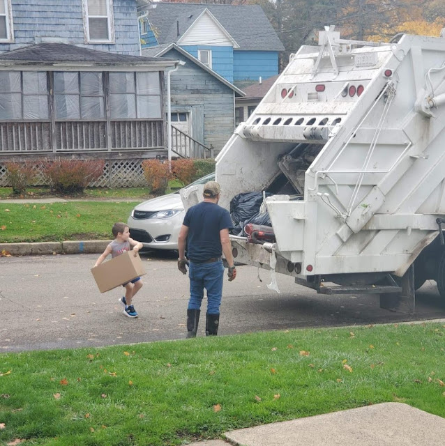Charlie says he likes to help them because they are all nice and they let him pull the lever to crush the garbage. They gave him a garbage truck at Christmas two years ago and he still plays with it every day! I think Levi used to be his favorite but now it’s Tom because he let him sit in the truck today.”