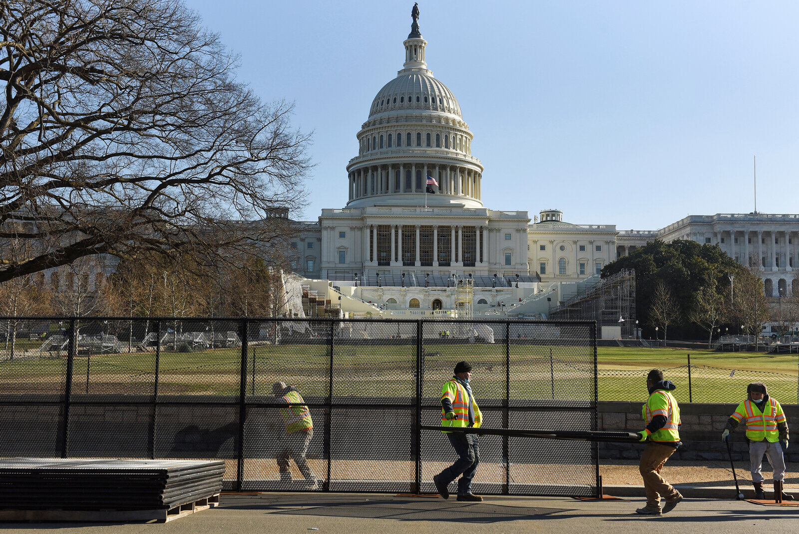 Workers install a fence in front of the U.S. Capitol on Thursday.