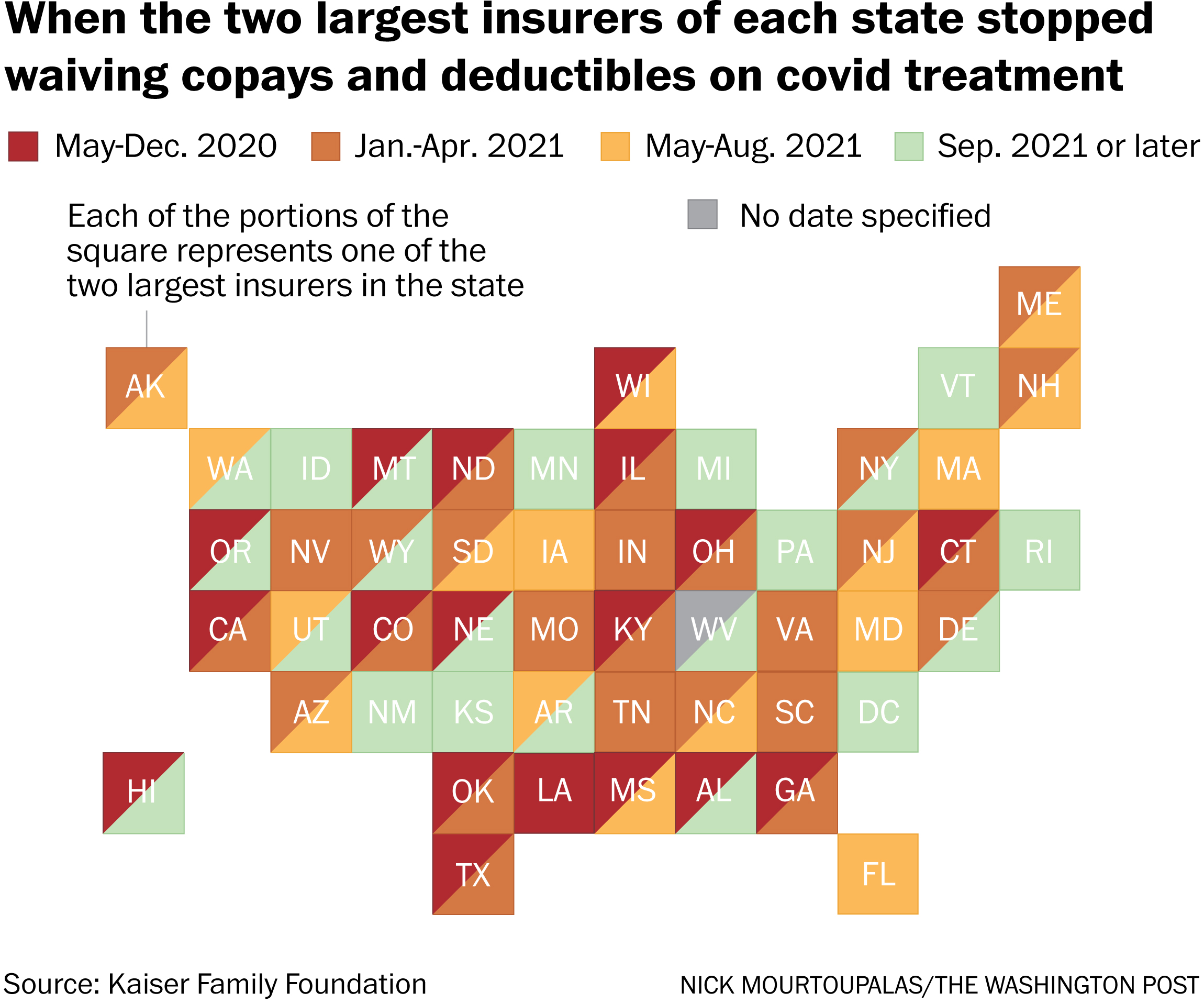 Last year, according to the Kaiser Family Foundation, 88 percent of people covered by private insurance had their co-pays and deductibles for covid treatment waived. By August 2021, only 28 percent of the two largest plans in each state and D.C. still had the waivers in place, and another 10 percent planned to phase them out by the end of October, the Kaiser survey found. Its survey this year of employer-sponsored plans reflected similar patterns.