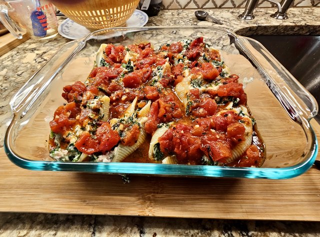 Just about to pop them in the oven. A lot of work, but I'm freezing one pan for later, and photo will easily make two meals, so I guess all the effort is worth it.